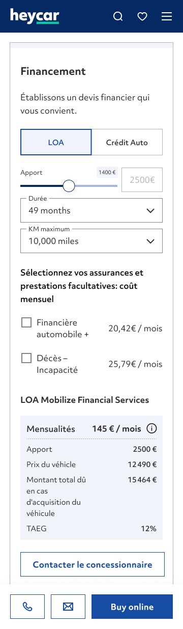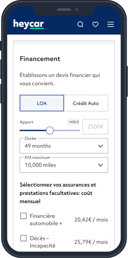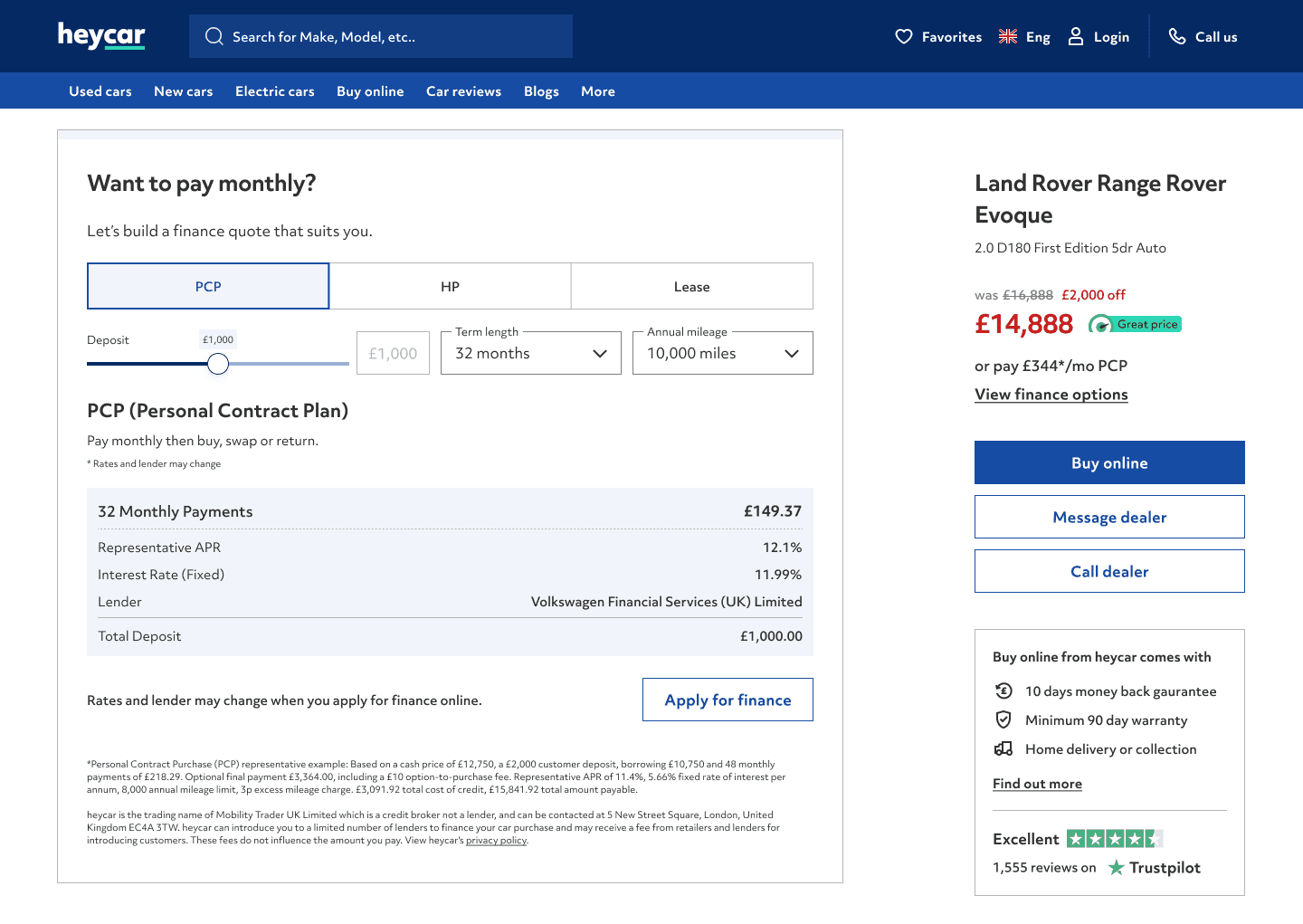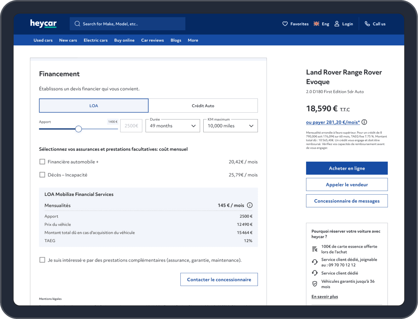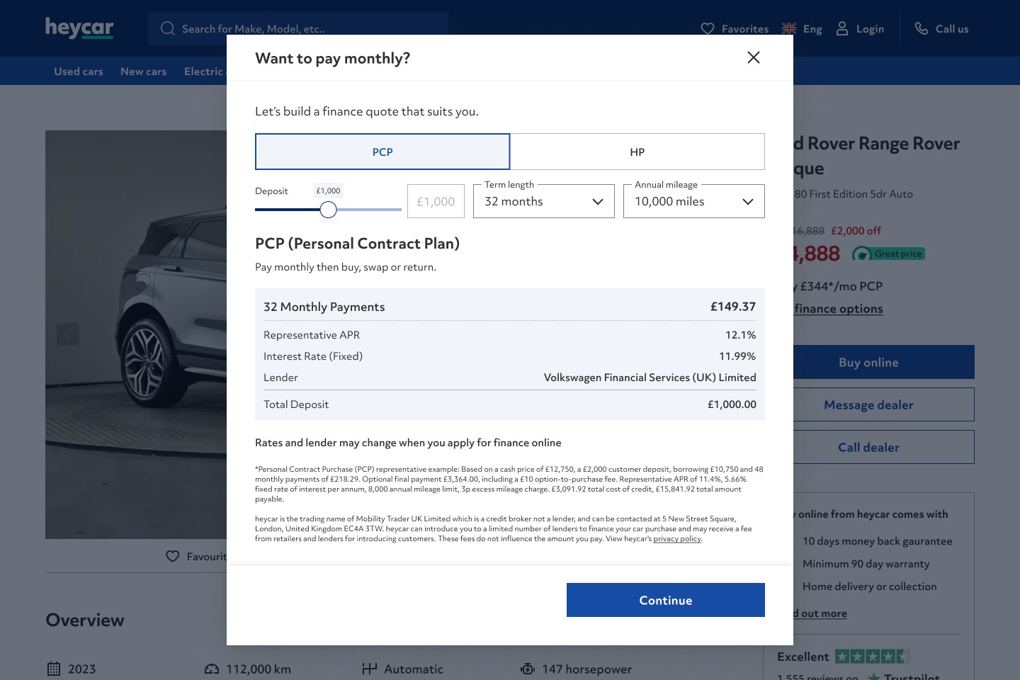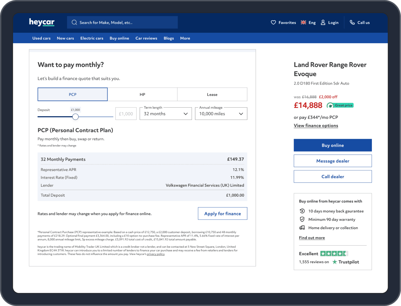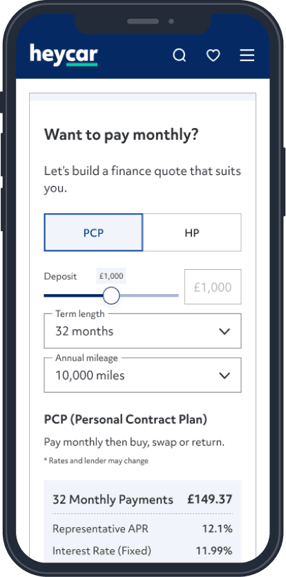 Shoppers on heycar can configure finance on eligible cars directly from the vehicle details page. They adjust the deposit and term to instantly see updated monthly payments, APR, and total amount payable, with market-specific rules (rates, caps, eligibility) applied automatically.